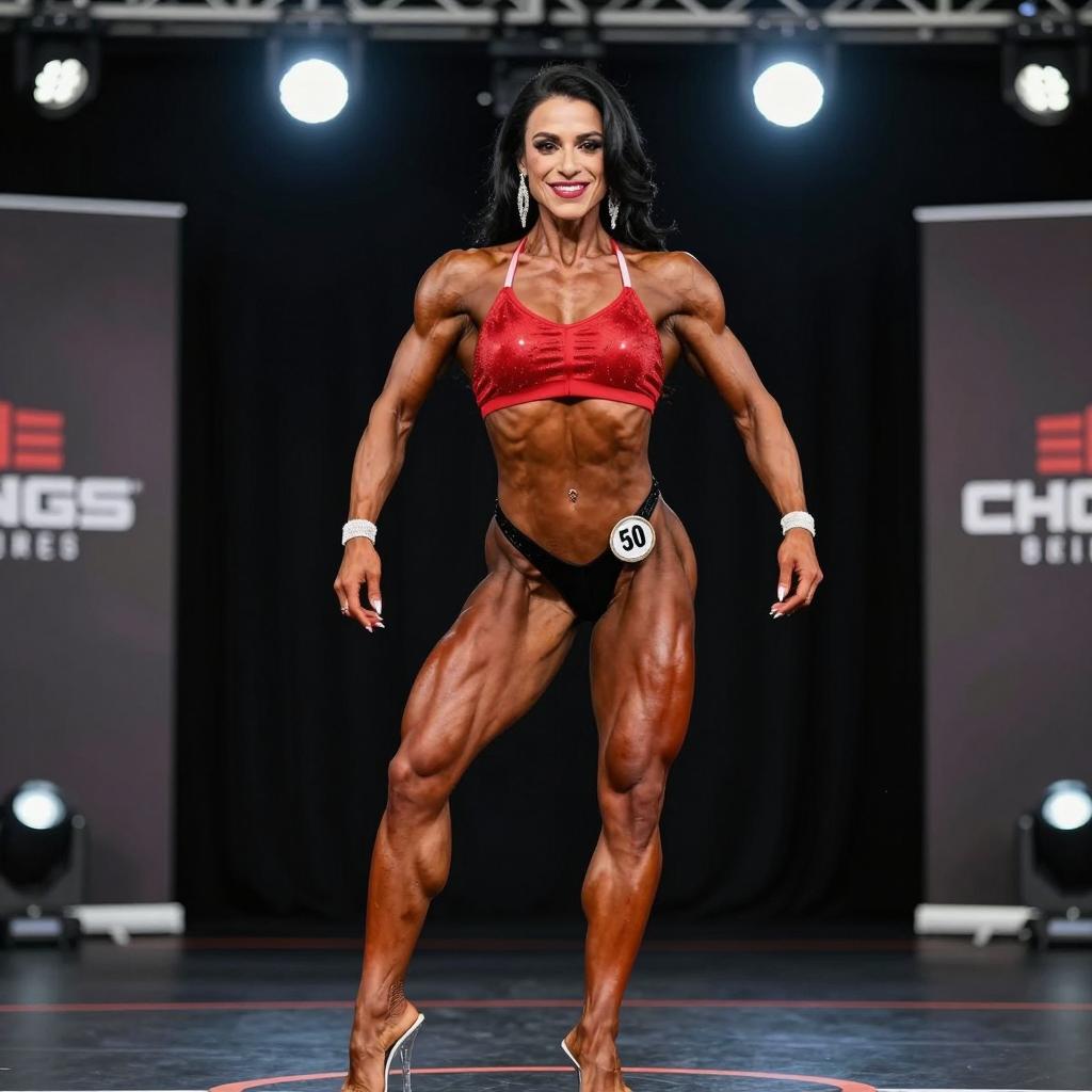 Full body portrait of fit woman with sixpack abs and powerful muscular physique, wearing white racerback sports bra and dark grey training shorts on competitive female bodybuilder with broad shoulders and confident smile posed most muscular pose with shoulders hunched and fists in front of waist in concrete gym wall with subtle texture under rim lighting on shoulders and arms separating her from the background, intense bodybuilding photography, high resolution, ultra-detailed