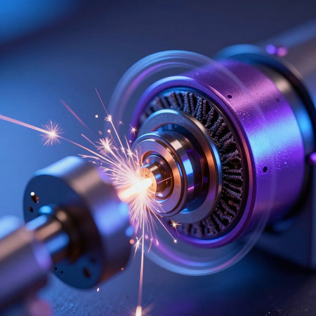 Close-up of a buzzing filter in action, intricate mechanical parts vibrating, emitting soft electric sparks, surrounded by dynamic waves of sound and light, vibrant blues and purples with a metallic texture, hyperrealistic and detailed.