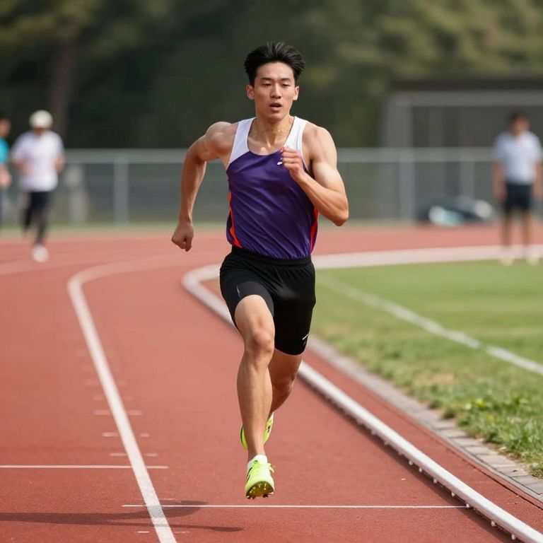 Photograph of an Asian male runner, mid-stride, on a red track with white lane lines. He has short black hair, a muscular build, and is wearing a sleeveless purple and white athletic top with black shorts and bright yellow running shoes. His expression is focused, mouth slightly open. In the blurred background, there are two other runners, one in white and black, and a green grassy area with a fence. The track curves gently to the right. The image has a slightly exaggerated, almost hyper-realistic style.