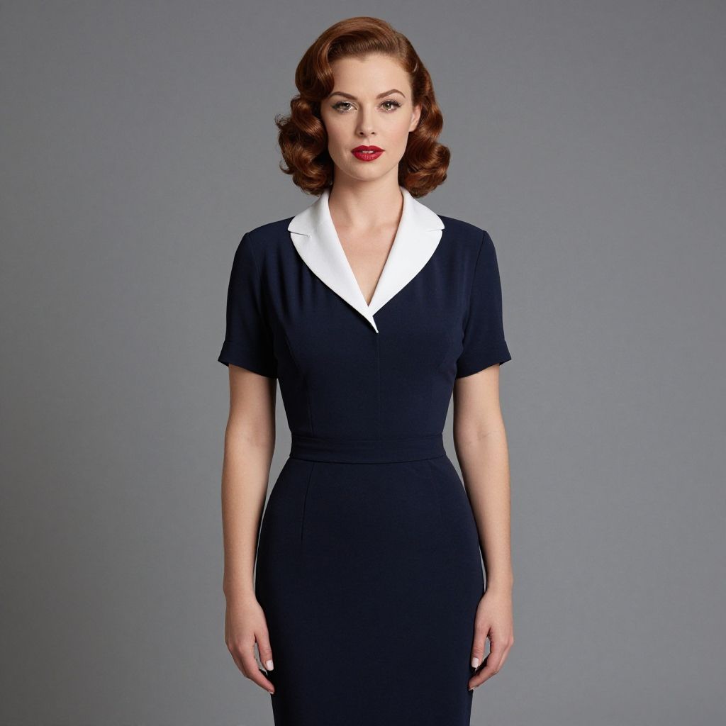 Portrait of a poised woman wearing a sleeveless wide-leg belted jumpsuit with a wrap-front neckline. The jumpsuit features a midnight blue base with bold cobalt and white vertical stripes. She has soft vintage-inspired waves in her hair and is wearing red lipstick, standing confidently against a plain dark background with one hand in her pocket and the other resting on her hip.