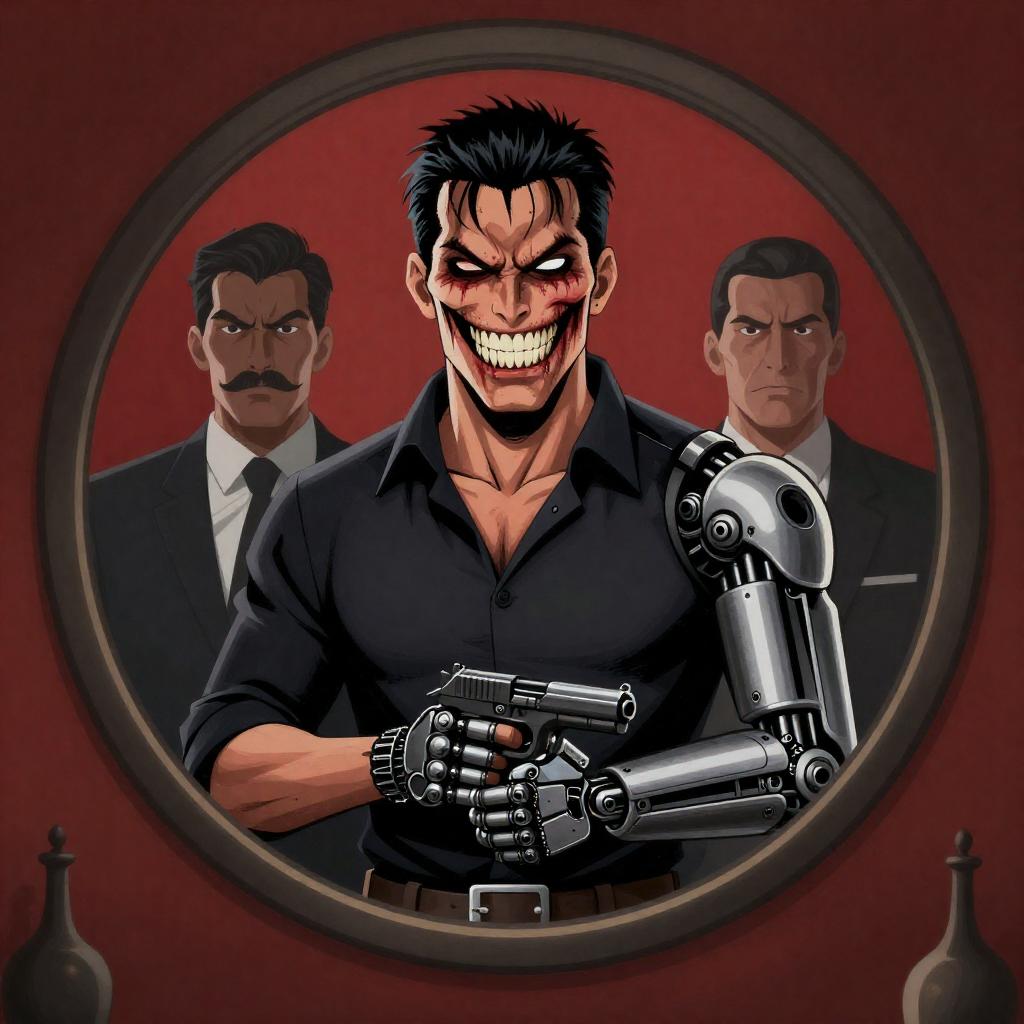 Graphic illustration of a menacing man with a gruesome, toothy grin, dark shirt, and mechanical arm holding a gun. He stands behind a circular mirror reflecting two men in suits, one with a mustache, against a red background.