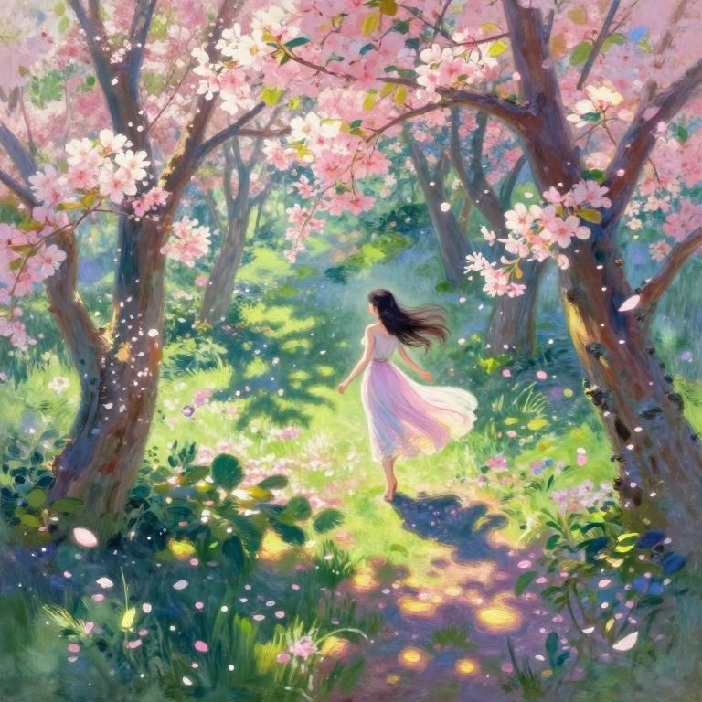 A captivating blend of impressionism and manga aesthetics portrays an idyllic scene within an ancient grove filled with softly blooming flowers. From an elevated vantage point, viewers are invited to drift above the enchanting landscape, taking in the ethereal beauty of the petals. As sunlight filters through the blossoms, it weaves intricate patterns of light and shadow across the verdant floor, evoking a dreamlike atmosphere reminiscent of Monet's renowned works. Amidst this magical setting, a mesmerizing female figure with flowing locks, painted in vibrant hues characteristic of anime, gracefully traverses the forest, embodying both the allure and enigma of nature. This spellbinding image encourages the viewer to immerse themselves in an emotional spectrum of serenity and awe, as the interplay of light and shadow weaves together an unforgettable visual tapestry.