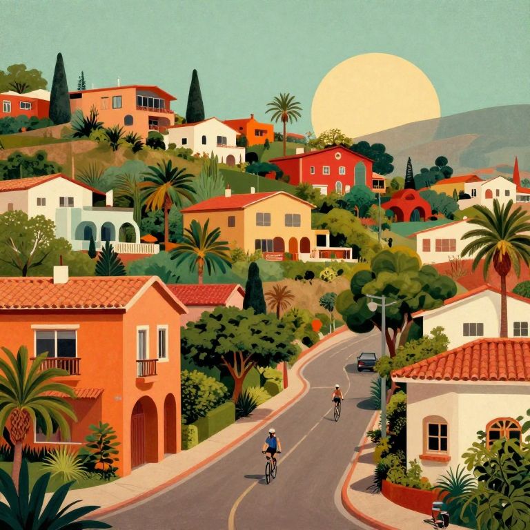The image presents a vibrant, mid-century modern neighborhood reminiscent of a Spanish folk art style, evoking a nostalgic atmosphere from the 1950s. The scene is hyper-detailed, with a faded, almost psychedelic quality that adds a sense of depth and texture. The composition is rich with a variety of shapes and colors, including warm oranges, reds, and greens, which create a harmonious and inviting environment. The buildings, with their curved rooftops and arched doorways, are arranged in a tiered fashion, cascading up the hillside, and are interspersed with lush greenery and palm trees. The winding road that cuts through the neighborhood is lined with trees and bushes, leading the eye towards the bright, circular sun in the background. Two cyclists are seen riding along the road, adding a dynamic element to the otherwise static scene. The overall composition is balanced, with elements carefully placed to create a sense of harmony and rhythm, capturing the essence of a tranquil, idyllic neighborhood.