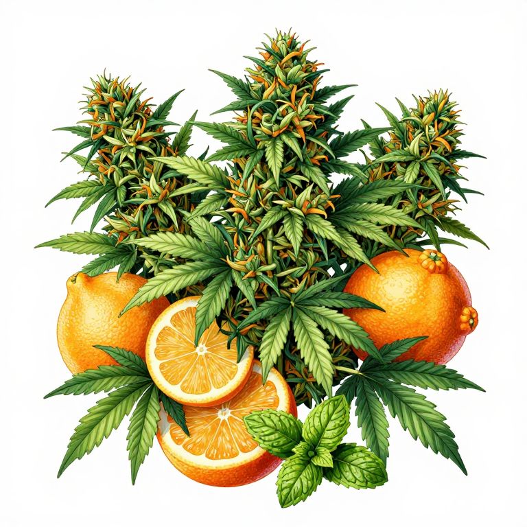 This detailed digital illustration depicts a vibrant arrangement of cannabis plants and oranges. The image showcases three bright orange fruits, one whole and two halved, revealing juicy segments. Surrounding the oranges are lush, green cannabis leaves with intricate serrated edges and small, spiky buds. A sprig of fresh green mint leaves is also included. The background is pure white, making the colors of the oranges and leaves pop. The illustration style is realistic with a slight artistic flair, emphasizing the textures and natural beauty of the cannabis and citrus.