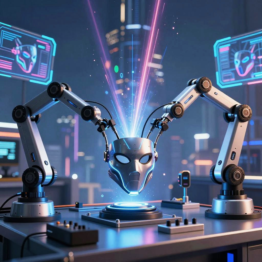 High-tech mask generator with robotic arms crafting sleek, futuristic masks, neon blue and silver color palette, detailed cyberpunk cityscape in the background, vibrant energy beams and holographic projections surrounding the scene.