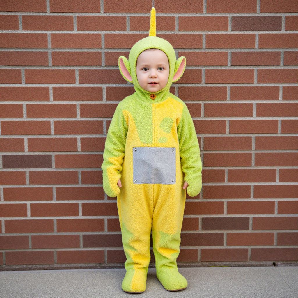 Teletubbies Laa Laa Adult Jumpsuit Costume, child in a green and yellow costume standing in front of a brick wall