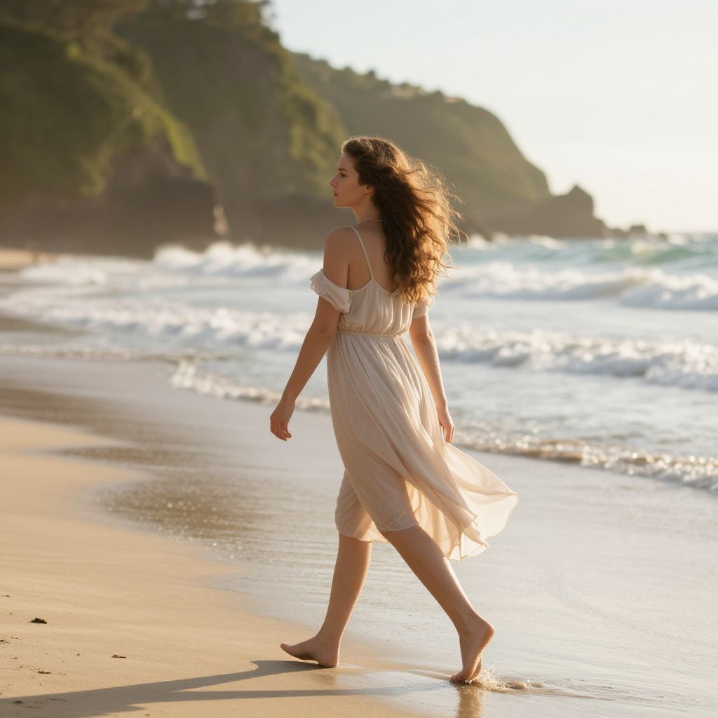 A woman with flowing, wavy hair walks gracefully along a serene beach, her light, airy dress fluttering in the gentle breeze. The sun casts a warm glow on the scene, highlighting the peaceful waves and lush cliffs in the background, creating a perfect blend of nature and beauty.
