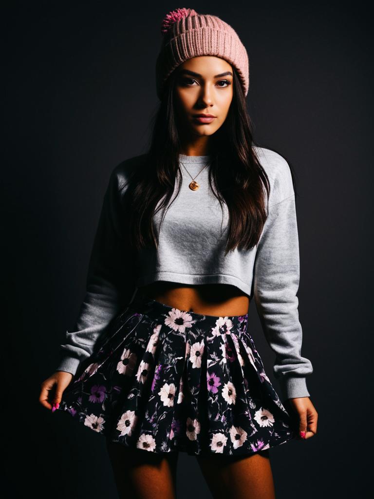 Portrait of a young woman posing against a plain dark grey background wearing a grey cropped sweatshirt with long sleeves and a round neckline, a pleated black midi skirt with pink and purple floral prints, and a brown knitted beanie with a pom-pom. She has long dark hair and is accessorized with a simple round gold pendant necklace. The look combines casual and chic elements.