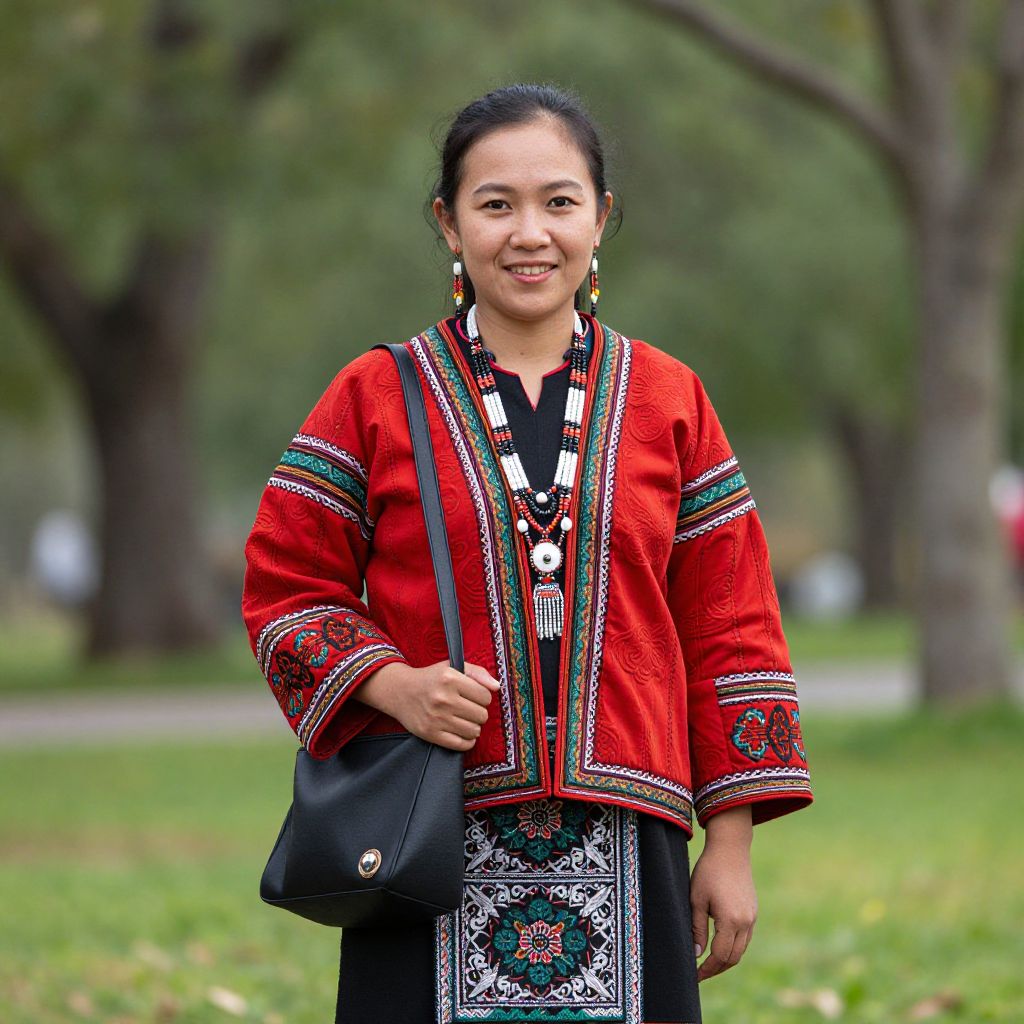 Photograph of an East Asian woman with a medium build, dark hair in a ponytail, and fair skin, standing outdoors in a park. She wears a vibrant red traditional embroidered blouse with black, white, and green patterns, and a black skirt with intricate designs. She carries a black shoulder bag and has long, dangling earrings. The background shows blurred green grass and trees, with a path visible. She smiles gently at the camera, exuding a calm and confident demeanor. The image captures rich cultural attire and a natural, serene setting.