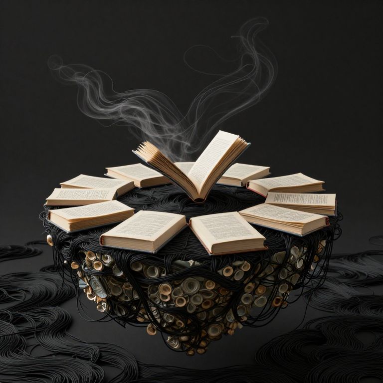 A floating island composed entirely of books hovers over a sea of black silken threads, each page turning gently, rewritten by the wind itself.