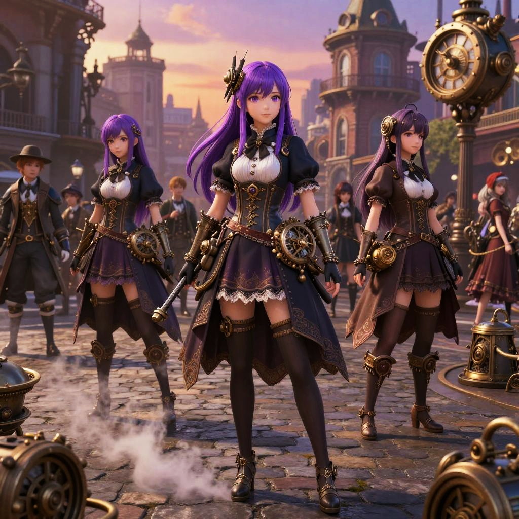 Purple haired anime girls in a steampunk city plaza, Victorian-style clothes mixed with mechanical accessories, steam rising from cobblestone streets, intricate clockwork gadgets, expressive faces, a crowd of varied characters in the background, dusk lighting with orange and purple tones
