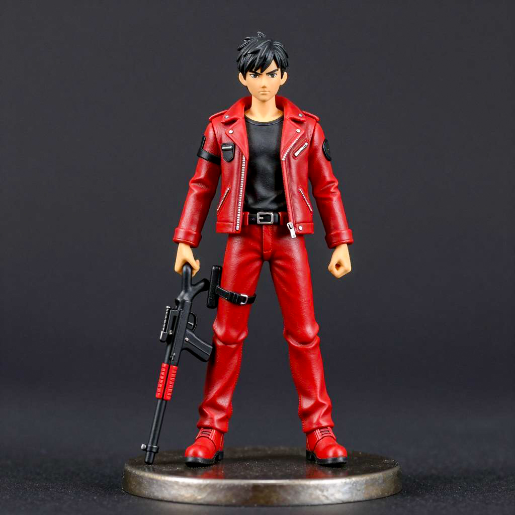 Male figure in a black leather jacket with red heart on chest, black pants, gloves, and cap. Black background. Standing on a black circular base with red accents. Short dark hair, intense expression. Realistic CGI style. Jacket has pockets and patches. Black belt. Black shoes. Hands in gloves, jacket sleeves rolled slightly.