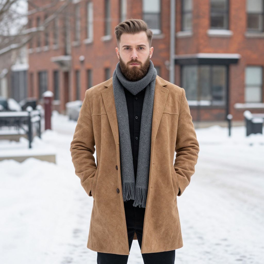 A photograph of a bearded man with light brown hair standing in a snowy urban street. He's wearing a tan suede coat with a gray scarf, black shirt, and dark pants. His hands are in his coat pockets. The background shows red brick buildings with snow-covered sidewalks and windows. He has a serious expression and looks directly at the camera.