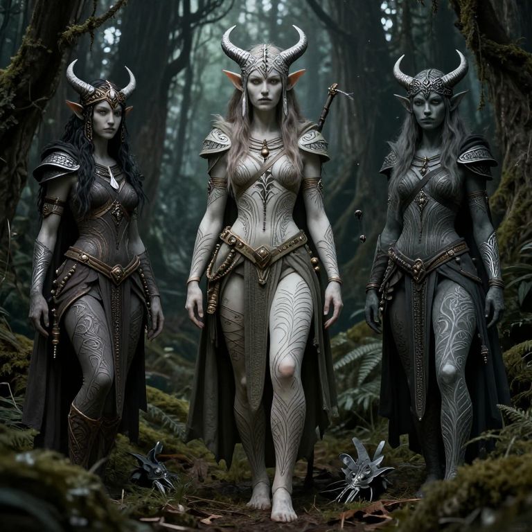 A highly detailed, dark forest scene featuring female trolls with intricate Viking art and micro detail, rendered in the styles of Brian Froud, Yoshitaka Amano, Yoji Shinkawa, and Jeremy Mann, and trending on ArtStation.