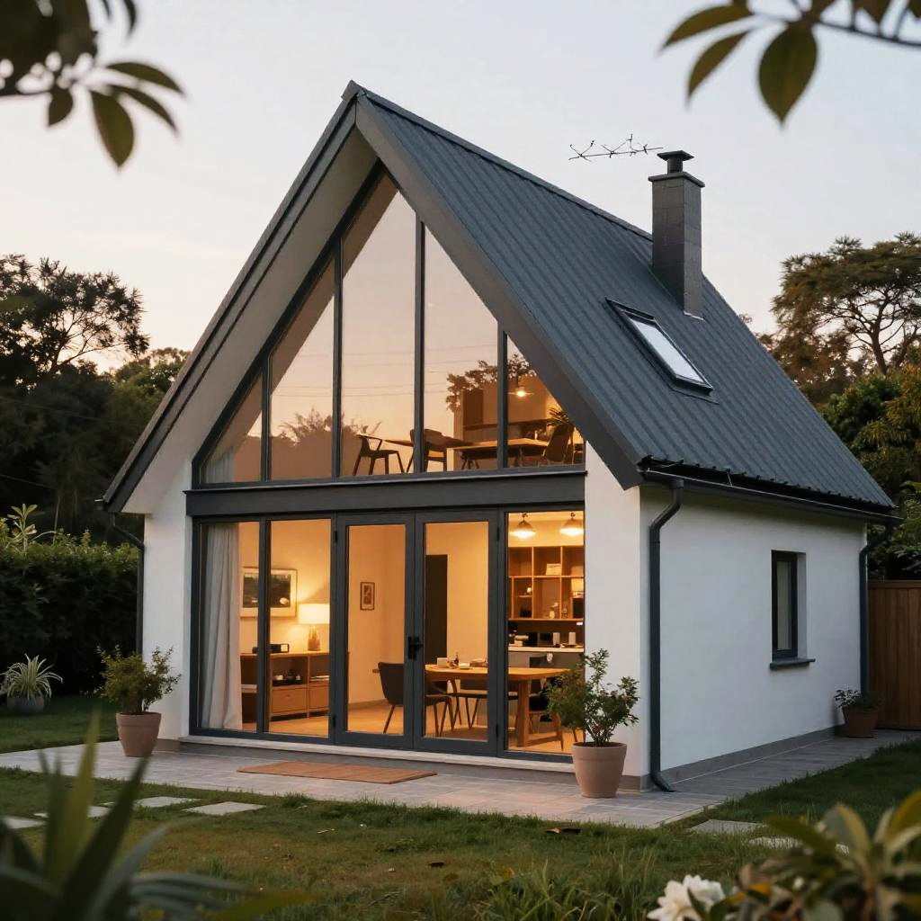 Winkelbungalow, charming single-story house with a modern angular design, large glass windows, surrounded by a lush garden, soft natural lighting during golden hour, cozy and inviting atmosphere, detailed exterior and minimalistic interior visible through windows