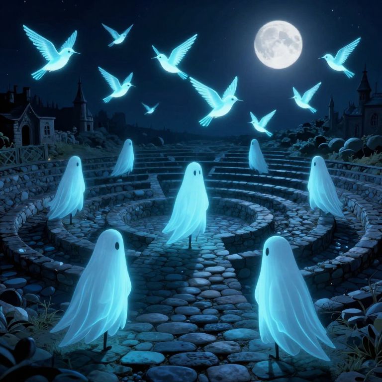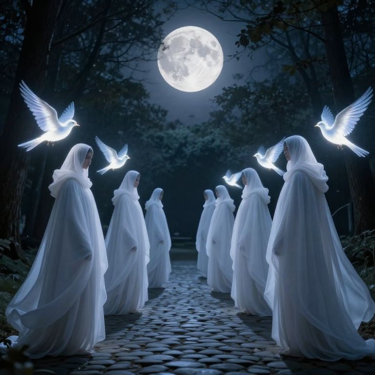 Ghosts in flowing white robes stand solemnly along a cobblestone path, each accompanied by luminous birds that flutter gracefully beneath a radiant full moon, creating a serene and ethereal nocturnal scene.