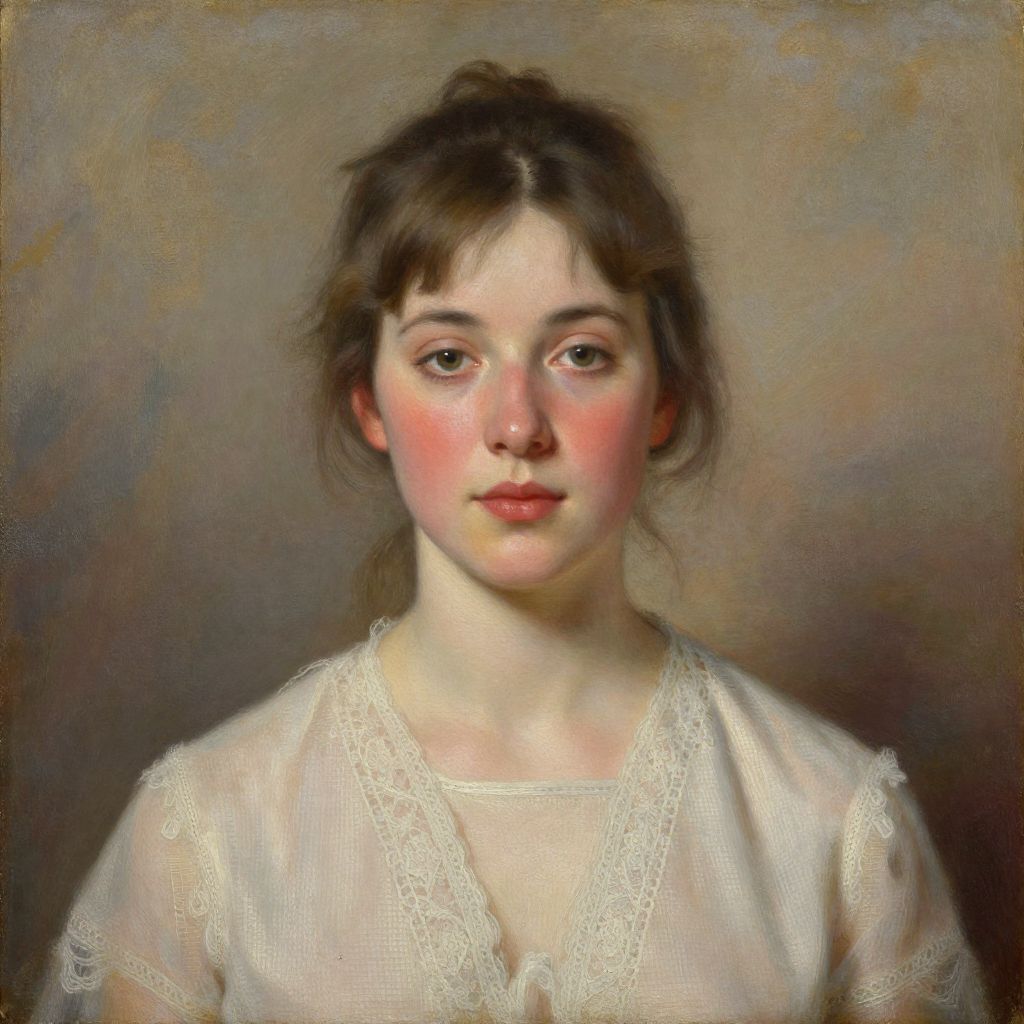 A classic portrait by Perry Nichols from 1936, rendered in a realistic oil painting style, featuring a woman with soft, rosy cheeks and a delicate lace-trimmed blouse against a subtly textured background.