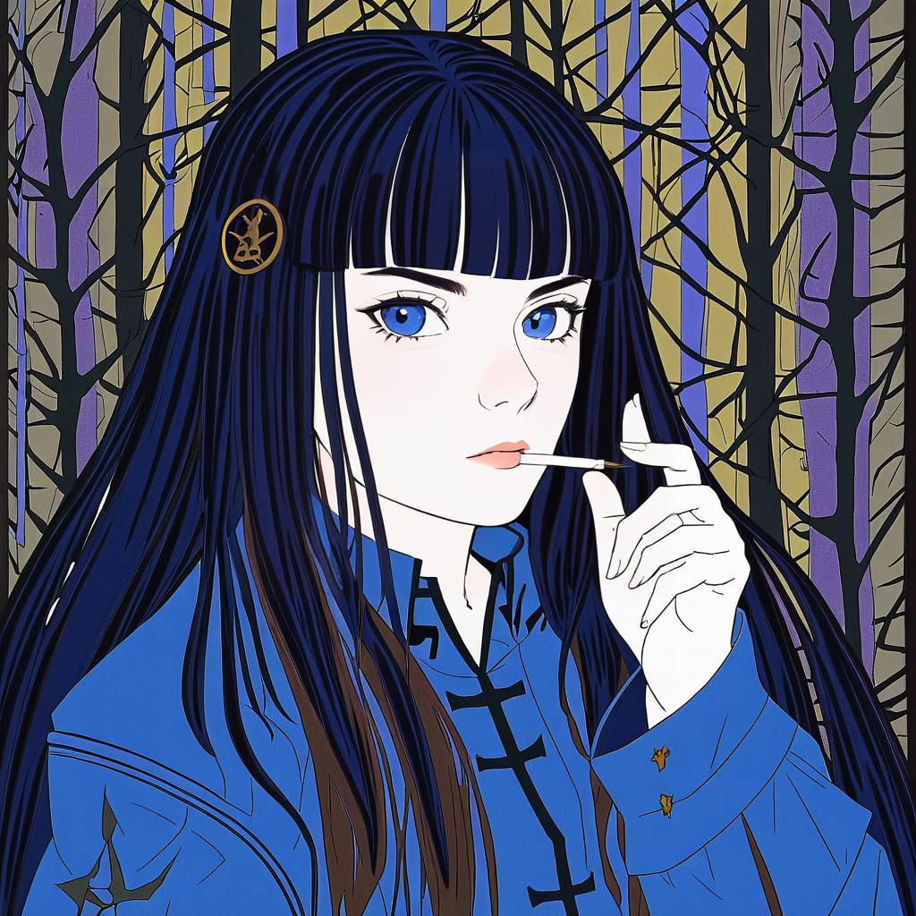 Anime-style digital illustration of a young woman with long black and brown hair, striking blue eyes, and pale skin. She wears a blue traditional-style outfit featuring black fastenings and holds a cigarette between her fingers. The background depicts abstract tree branches in muted blue, purple, and beige tones.