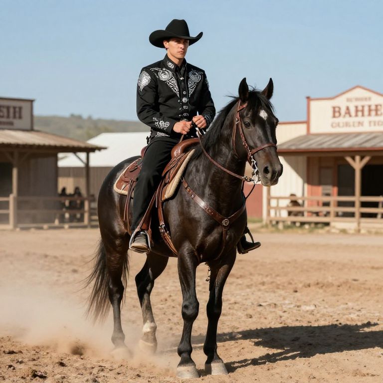 Photograph of a man riding a black horse in a dusty, sunlit Western town. The rider, with light skin and a slight smile, wears a black cowboy hat, a detailed black shirt adorned with white embroidery, and black pants. The horse is dark brown with a shiny coat, equipped with a brown leather saddle and bridle. In the background, there are wooden buildings with signs that read "BATH" and "GENERAL STORE" under a clear blue sky. Dust is kicked up beneath the horse's hooves, adding a dynamic sense of motion.