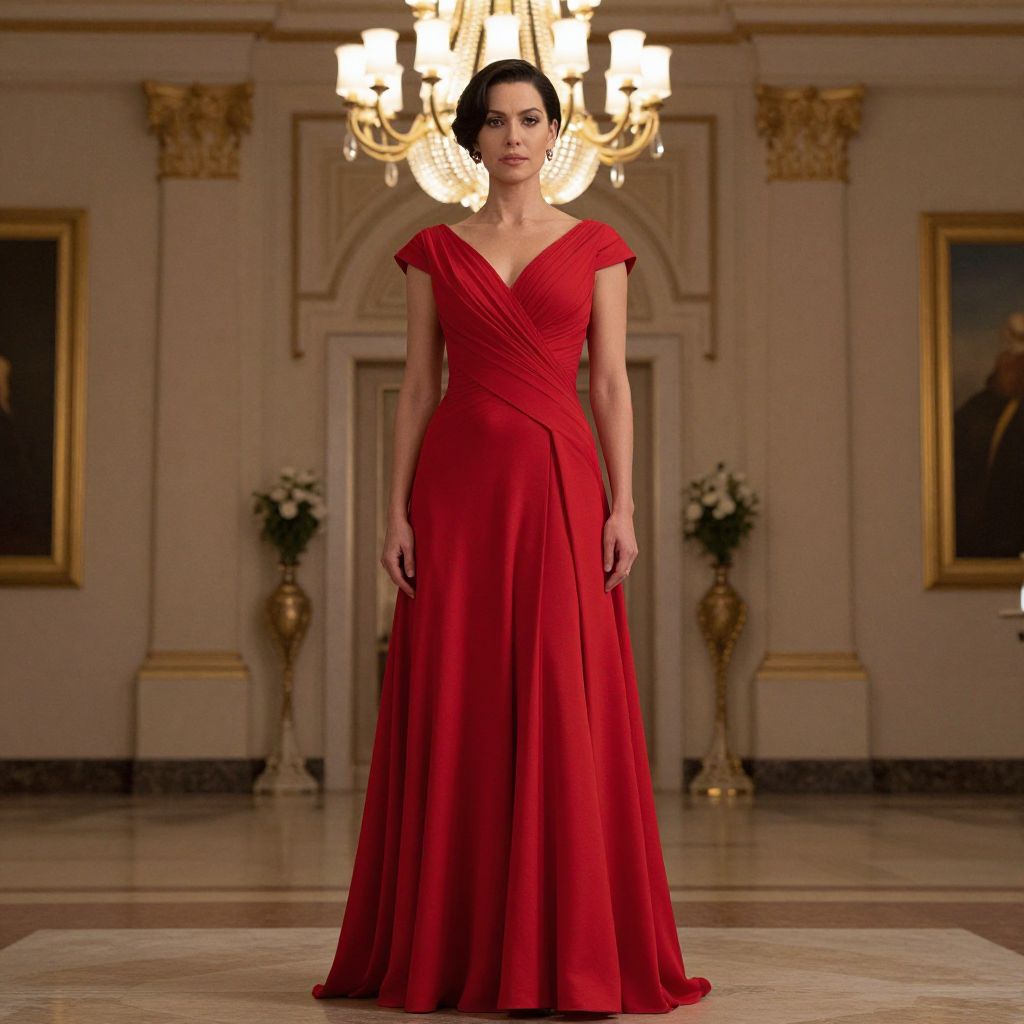 Photograph of a young woman standing in an elegant, classical-style room. She wears a striking, form-fitting, off-the-shoulder red gown with a deep V-neck and subtle pleating. Her dark hair is styled in an elegant updo. The background features a large, ornate chandelier, cream-colored walls with gold accents, and two tall, gold vases with white flowers on either side of a central doorway. The floor is polished marble, and two framed paintings hang on the walls. The overall scene exudes sophistication and formal elegance.
