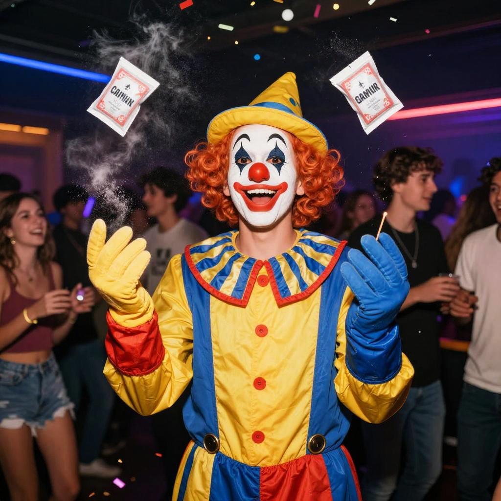 Cocaine clown juggling white powder packets, wearing colorful oversized gloves and hat, chaotic party scene with flashing lights and confetti, energetic and surreal vibe