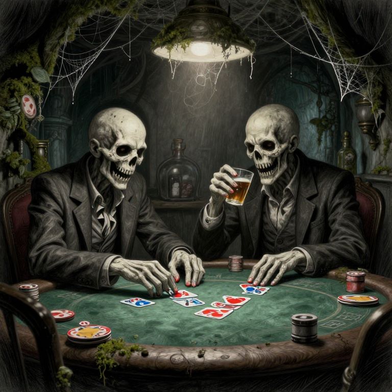 Digital artwork of two skeletal figures in black suits playing poker in a dark, dimly-lit cave with cobwebs, holding drinks and cards.