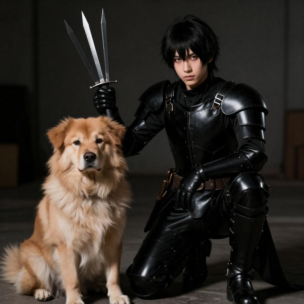 Photograph of a dark-haired person in black, glossy, latex-like armor kneeling beside a fluffy, light brown dog. The person holds multiple sharp, metallic blades in their right hand. The background is dimly lit, creating a dramatic contrast with the illuminated subjects. The dog sits calmly to the left, while the person gazes intently forward.