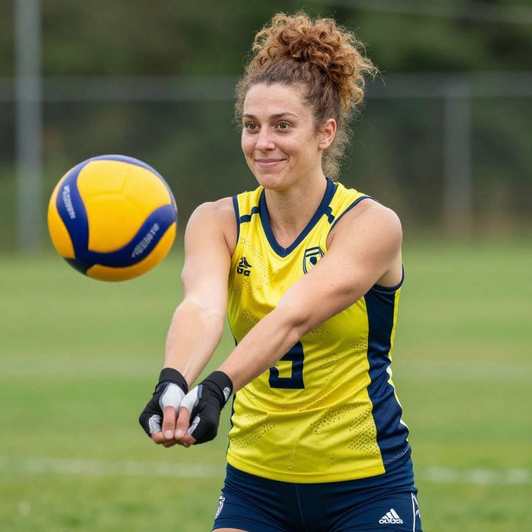 Outdoor sports photography of a female volleyball player in a colorful team volleyball outfit — bright yellow and navy blue with team logos — wearing padded athletic gloves and a sports bra with built-in support. She has a warm smile, hazel eyes, and curly auburn hair tied into a high bun, playing a quick pass on a grassy field during a match.