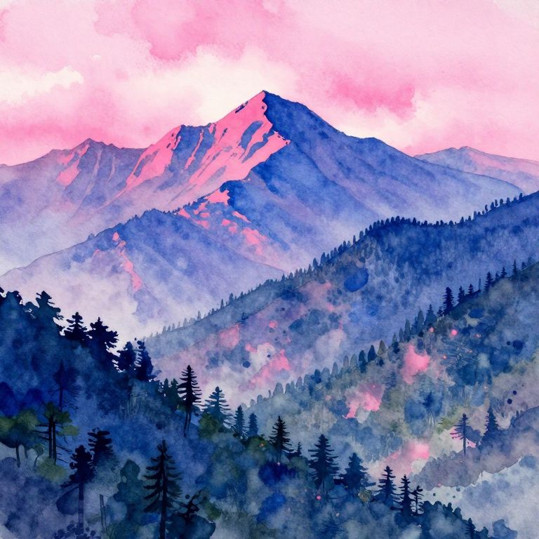 The image presents a striking watercolor painting of a mountainous landscape, dominated by a vibrant interplay of pink and blue hues. The mountains, rendered in shades of deep blue and purple, rise majestically against a backdrop of soft, pink clouds that seem to blend seamlessly with the peaks. The peaks themselves are adorned with streaks of pink, creating a sense of depth and dimension. The valleys and slopes are filled with a dense forest of dark green trees, their silhouettes contrasting sharply with the lighter tones of the mountains. Splashes of pink and blue are scattered throughout the scene, adding a dynamic and energetic quality to the composition. The overall effect is a harmonious blend of natural elements, with the mountains, trees, and sky all interacting in a visually captivating manner.