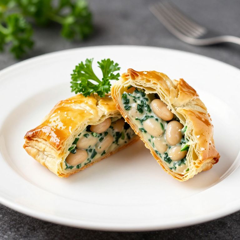 Golden puff pastry turnover, halved to reveal a creamy filling of white beans, green vegetables, and herbs, presented on a white plate with fresh parsley garnish.