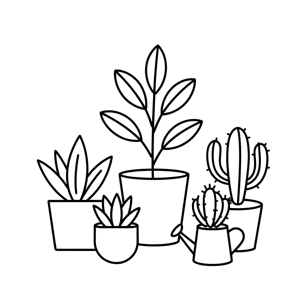 This is a minimalist line drawing in black and white. It features a collection of potted plants of various sizes, including a tall plant in a large pot, smaller plants in rectangular and round pots, and a few cacti. There's also a small watering can placed among the plants. The drawing has a clean, simple style with thin, precise lines. The background is plain white, emphasizing the plant arrangement.