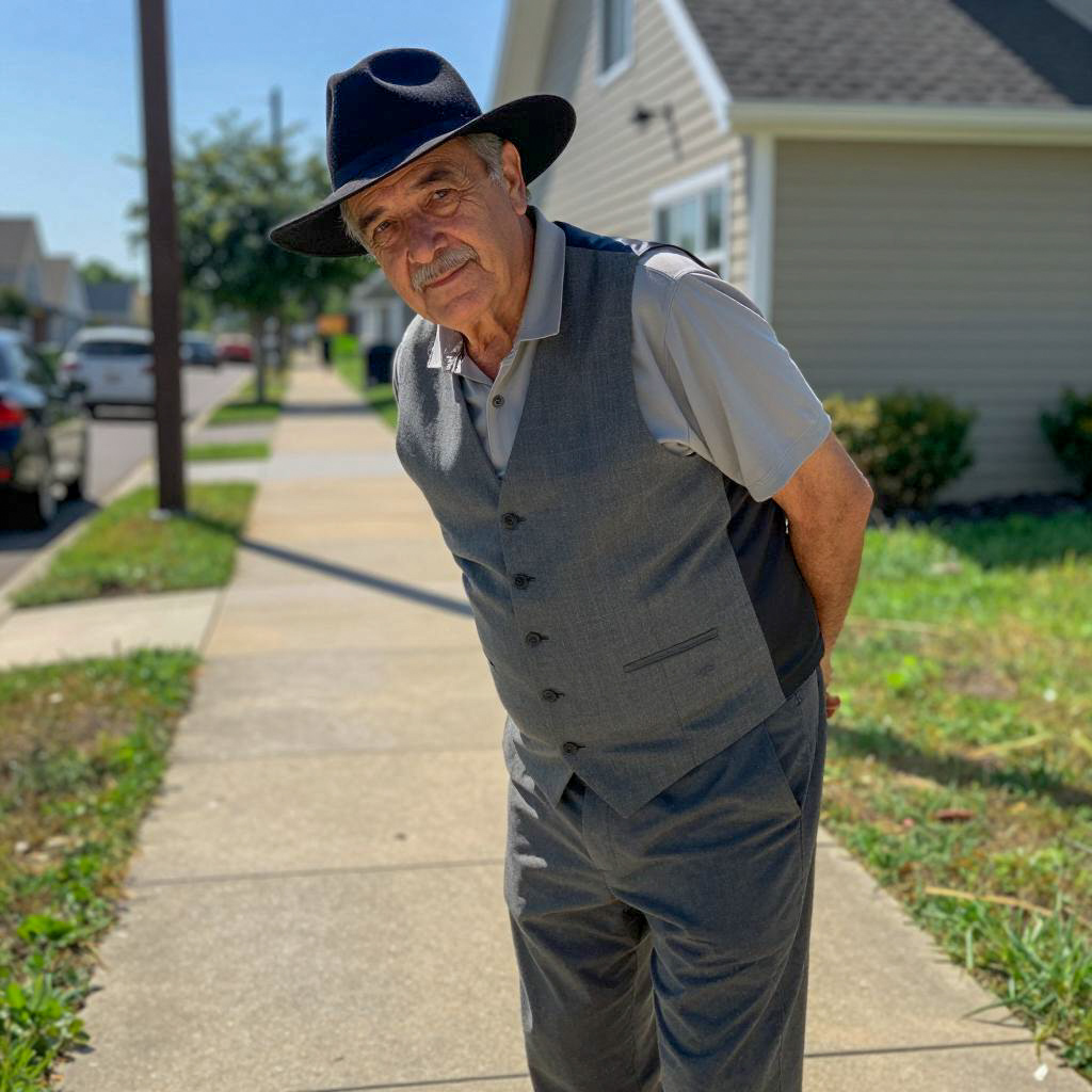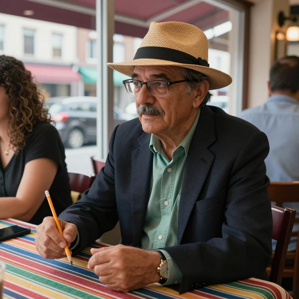 Middle-aged man with a mustache, wearing a straw hat, glasses, and a dark blazer over a green shirt, sits at a restaurant table. He points with his right index finger while holding a pencil in his left hand. Background includes a glass window, urban street with cars, and buildings. Two other people, one with curly hair on the left and another in a blue shirt on the right, are partially visible. Colorful striped tablecloth covers the table.