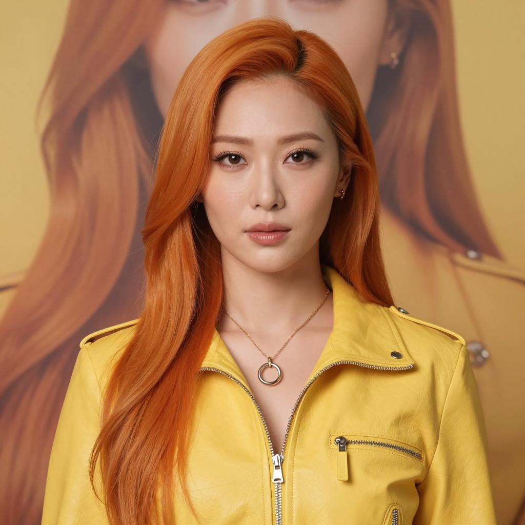 Photograph of an Asian woman with fair skin, wearing red satin gloves, covering her right eye. She has red lipstick, winged eyeliner, and her hair is slicked back. Dark background. Her expression is neutral, slightly parted lips. Gloves frame her face, one hand above her eye, other hand around her neck. Upper body visible, no clothing.