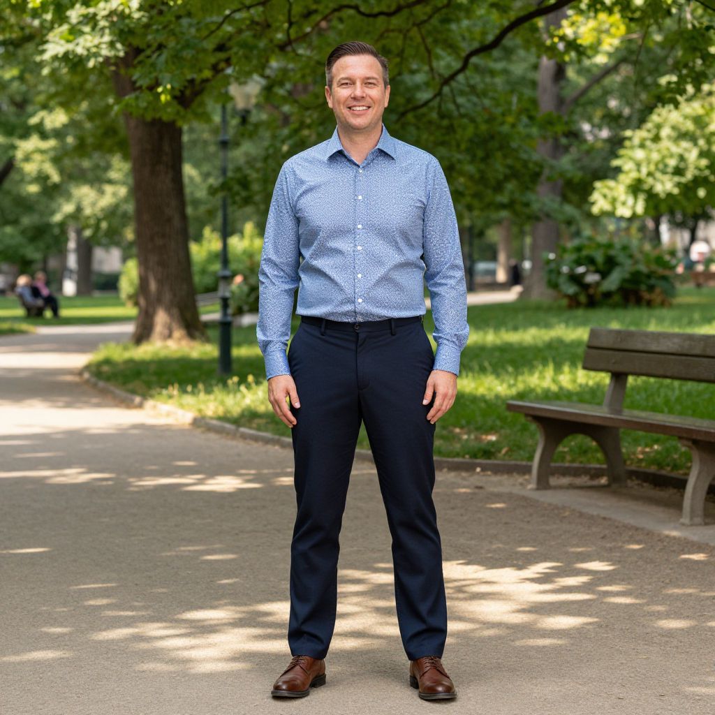 Photograph of a smiling man standing in a park. He's wearing a blue, patterned button-up shirt, dark navy pants, and brown leather shoes. His short brown hair is neatly combed. The background features lush green trees, a paved path, and a wooden bench to the right. Sunlight filters through the leaves, creating dappled shadows on the ground.