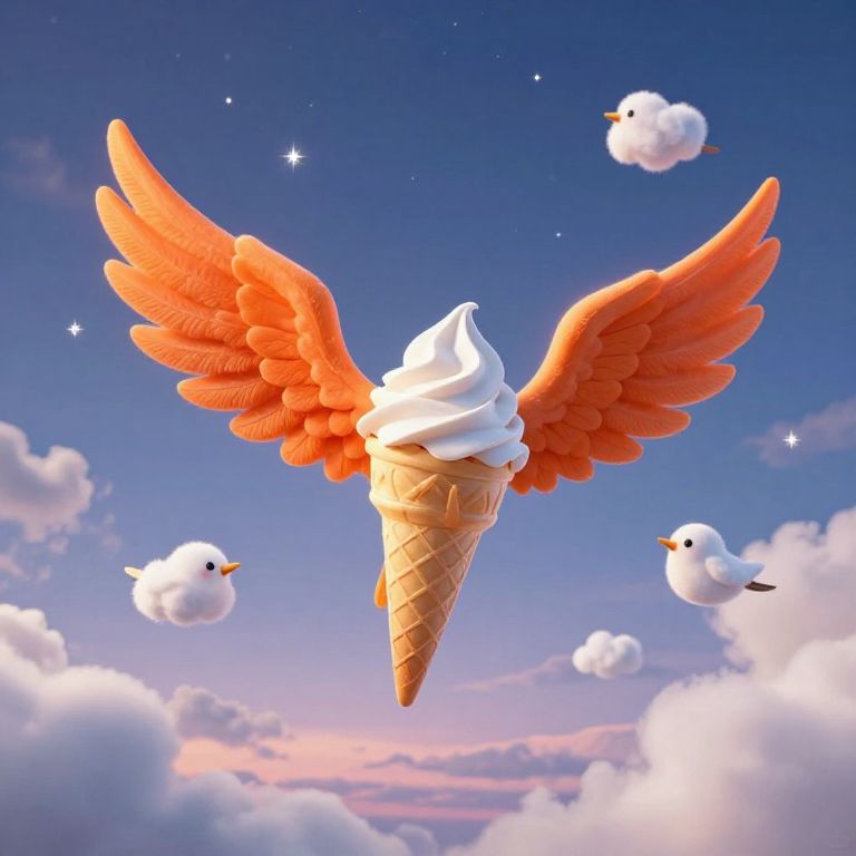 Digital illustration of a whimsical scene featuring a large, orange-winged ice cream cone with a swirl of white soft-serve ice cream at its center. The ice cream cone floats against a vibrant, twilight sky with fluffy white clouds and a gradient of blue to pink hues. Surrounding the cone are three small, white, cartoon-style birds with orange beaks, each hovering in the air. The birds and ice cream cone are illuminated by soft, twinkling stars scattered throughout the sky, adding a magical, dreamy quality to the image. The overall style is playful and surreal.