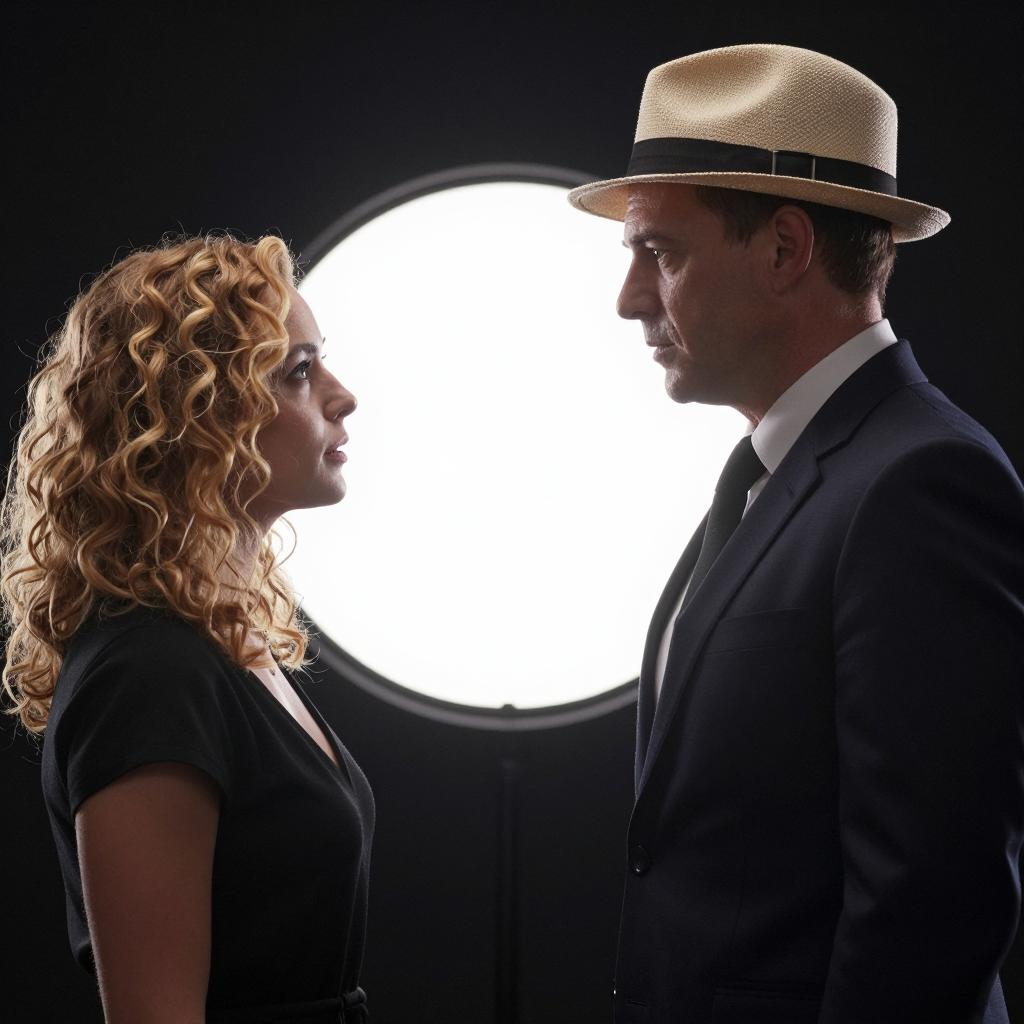 An older man with a white hat and light gray suit, talking to a woman with curly brown hair and a white shirt with a black vest. They stand in front of a brightly lit casino sign with "CASINO" in large white letters. Several people are blurred in the background. The man has a slight smile, and the woman looks at him intently.