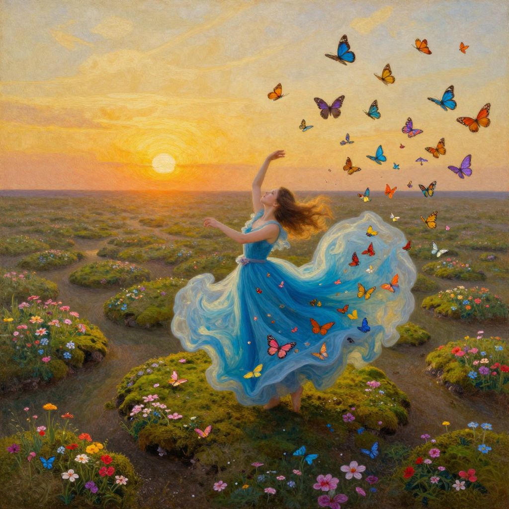 A mesmerizing blend of whimsical brushstrokes akin to Chagall's ethereal style and Pixar's animated vibrancy, this scene unveils an enchanting creature - a harmonious fusion of human and avian forms. The upper half reveals a female figure draped in an otherworldly gown, while the lower part gracefully transforms into the wings and body of a magnificent bird. This captivating artwork, with its rich color gradients and intricate details, transports viewers into a wondrous dreamscape illuminated by the glow of a sunset sky, evoking a sense of wonder and imagination that lingers long after the gaze is withdrawn.