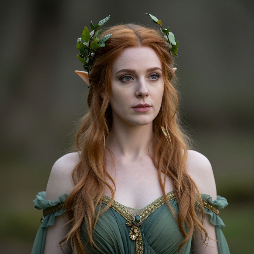 Photorealistic digital artwork of a fair-skinned, red-haired elven woman with pointed ears, wearing a green, off-shoulder gown adorned with gold embroidery and small green leaves. Her long, wavy hair cascades over her shoulders, and she has a crown of green leaves on her head. She has pale blue eyes and a serious expression. The blurred forest background adds a mystical atmosphere. The image emphasizes her ethereal beauty and fantasy character. The lighting highlights her delicate features and the texture of her hair and gown.