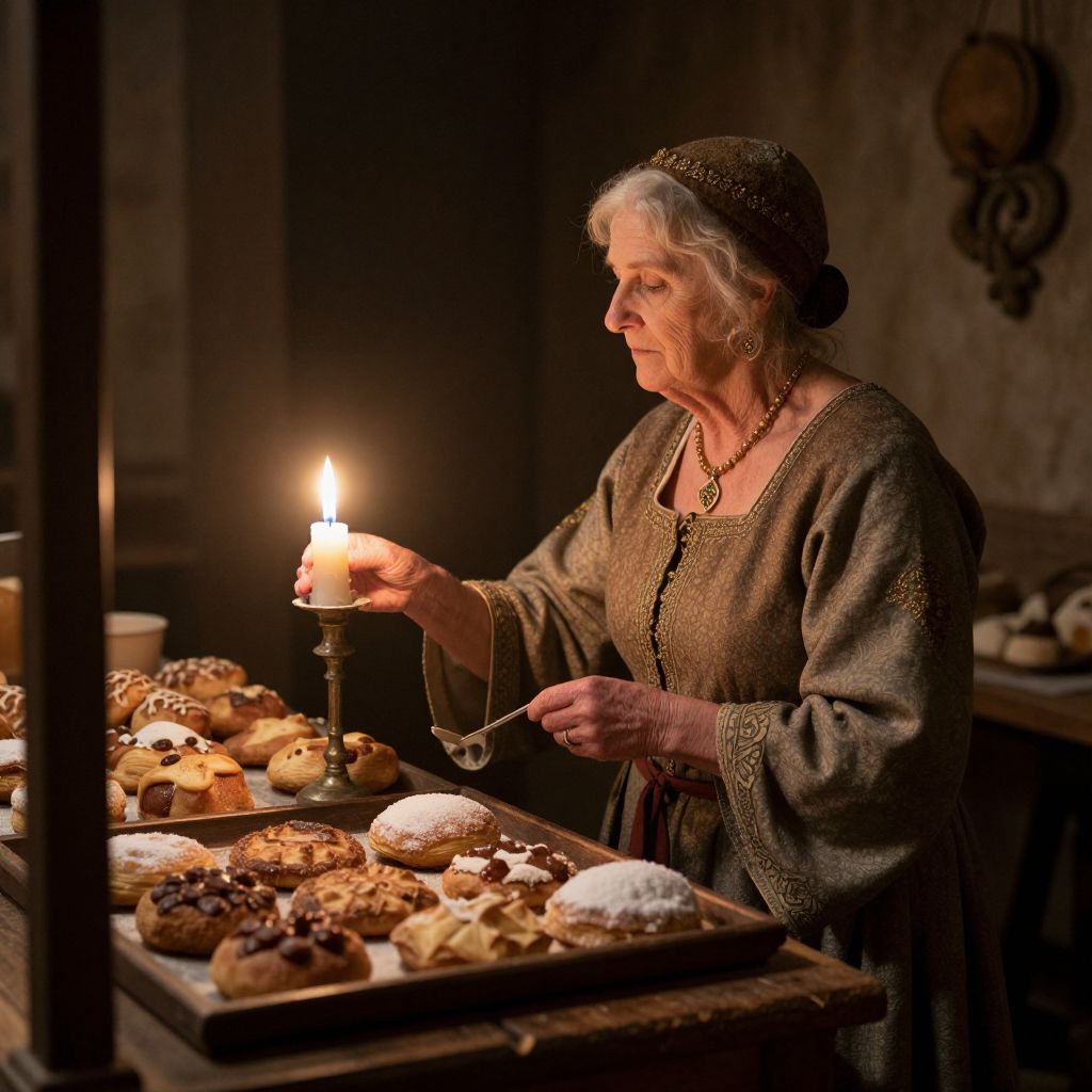 Photograph of an elderly white woman with gray hair and fair skin, wearing a brown, medieval-style dress with a headscarf, standing in a dimly lit kitchen. She holds a lit candle in her right hand and a spoon in her left, inspecting a tray of assorted pastries, including glazed donuts and powdered sugar-coated treats. The background is blurry, with dark, rustic walls and indistinct kitchen utensils. The warm candlelight casts a soft glow on her face and the pastries, creating a nostalgic, historical atmosphere. The woman's expression is focused and contemplative.