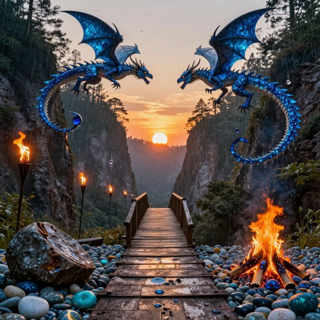 Photorealistic digital artwork depicts a wooden bridge in a misty, rocky canyon at sunset. Two majestic, blue-scaled dragons with glowing eyes and intricate wing patterns hover symmetrically above the bridge. Rain falls, adding a glossy texture to the bridge and rocks. Flames from torches on either side of the bridge cast warm light, contrasting with the cool blue dragons and the orange sunset. The canyon's steep cliffs are partially shrouded in mist, enhancing the mystical atmosphere. The image balances fiery and cool elements, creating a dramatic, fantasy-like scene.