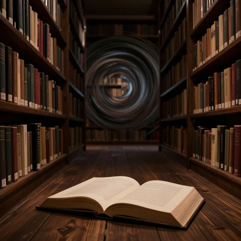 Books line the walls of a dimly lit library, converging into a swirling vortex of darkness at the center, while an open book rests on a wooden floor, its pages illuminated by a soft light, hinting at the infinite knowledge contained within.
