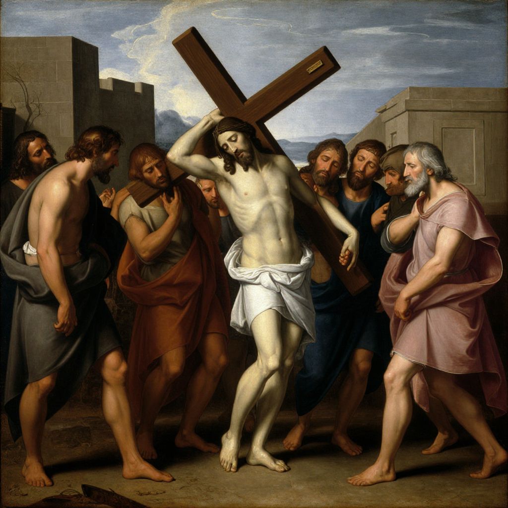 Oil painting depicting Jesus Christ riding a donkey into Jerusalem on Palm Sunday. Jesus wears a white robe with a red cloak and holds a palm branch. He is surrounded by cheering people holding palm branches, symbolizing celebration. The setting is an ancient city with classical architecture in the background. The artwork showcases realistic human features and dramatic lighting.