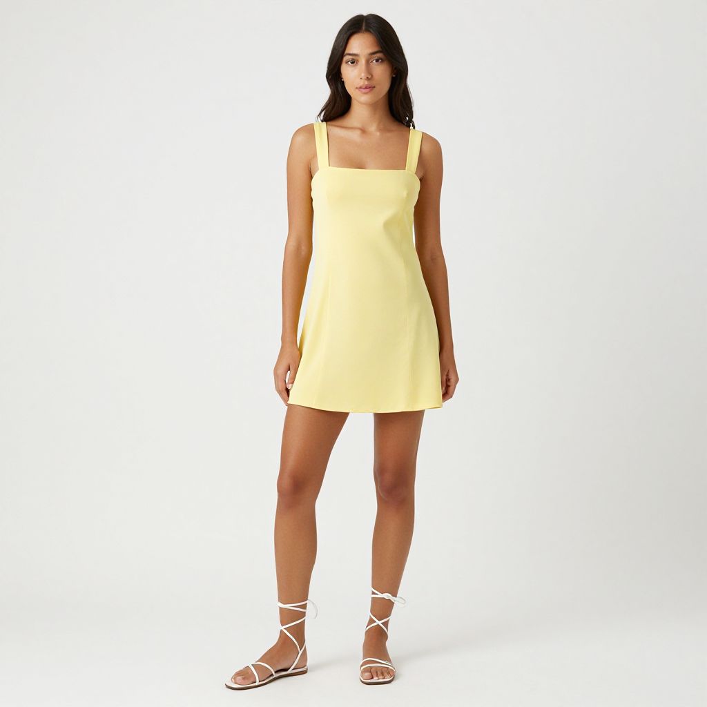 Photograph of a young woman with medium brown skin and shoulder-length black hair, standing against a plain white background. She is wearing a sleeveless, short, pale yellow dress with a square neckline and white, crisscross ankle strap sandals. Her expression is neutral, and she stands with her arms relaxed at her sides. The dress is simple and lightweight, highlighting her slim, toned physique. The image is brightly lit, emphasizing the clean, minimalistic style.