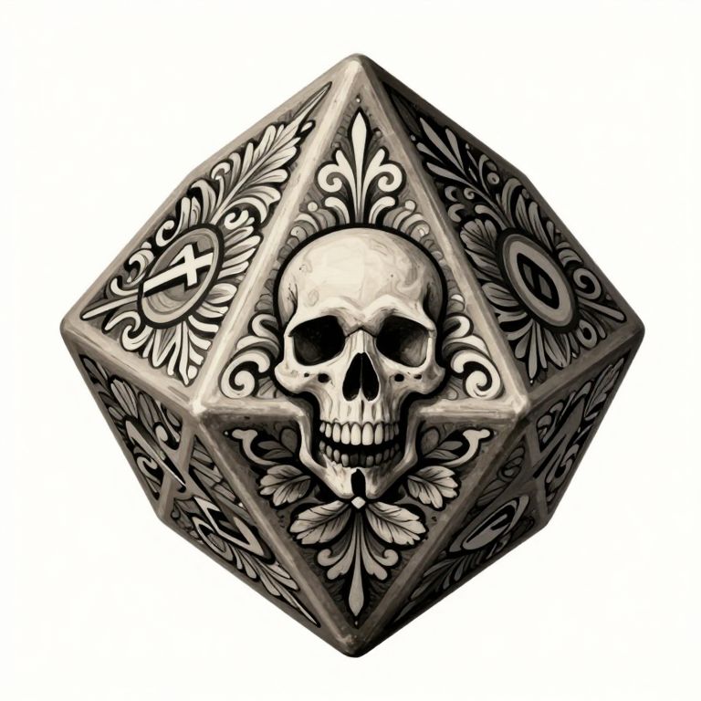 The image depicts a highly detailed, intricately designed 20-sided die, or D20, rendered in a traditional tattoo style. The die is adorned with a variety of elements, including a central skull, floral patterns, and various symbols. The skull, positioned at the center, is surrounded by a series of interconnected designs that include swirls, leaves, and other ornamental motifs. The die's faces are filled with these intricate patterns, creating a sense of depth and complexity. The overall color palette is monochromatic, with shades of gray and black dominating the scene, which enhances the tattoo-like aesthetic. The die's edges are sharp and well-defined, adding to the realism of the image. The spatial arrangement of the elements is balanced, with the skull serving as the focal point, while the surrounding patterns radiate outward, creating a harmonious composition. The interplay of shapes and textures, combined with the detailed rendering, gives the image a sense of depth and dimensionality.