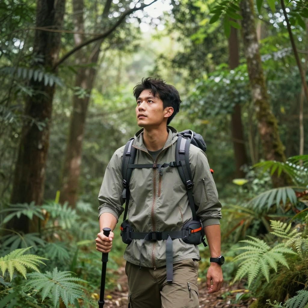 A man stands amidst the lush greenery of the Galapagos Islands in Ecuador, exuding a harmonious blend of nature and style. The artistic composition captures the serene essence of the islands while highlighting the man's poised presence.