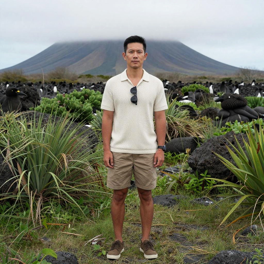 Photograph of a young Asian man with short black hair, standing in front of a volcanic landscape. He wears a white short-sleeved polo shirt, beige knee-length shorts, brown sneakers, and a black wristwatch. Sunglasses are hanging around his neck. Behind him, a large, mist-covered volcano rises against a cloudy sky. The foreground features lush green plants and black volcanic rocks. A group of black and white birds is scattered in the mid-ground, partially obscured by the vegetation. The image has a slightly over-saturated, vibrant color style.