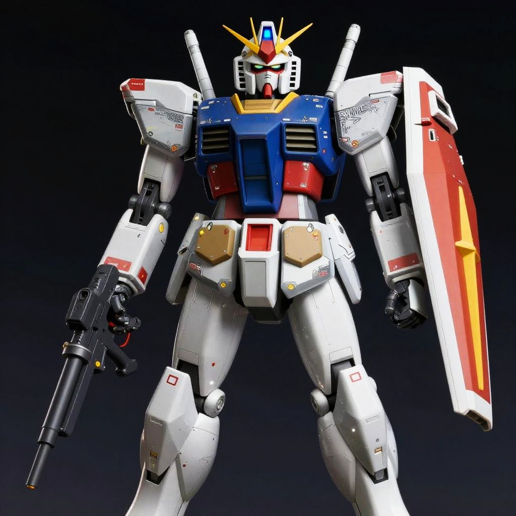 BJ_Gundam, solo, blue_eyes, standing, weapon, gun, no_humans, glowing, robot, mecha, science_fiction, space, v-fin, energy_gun, mobile_suit, beam_rifle, cinematic lighting, strong contrast, high level of detail, Best quality, masterpiece