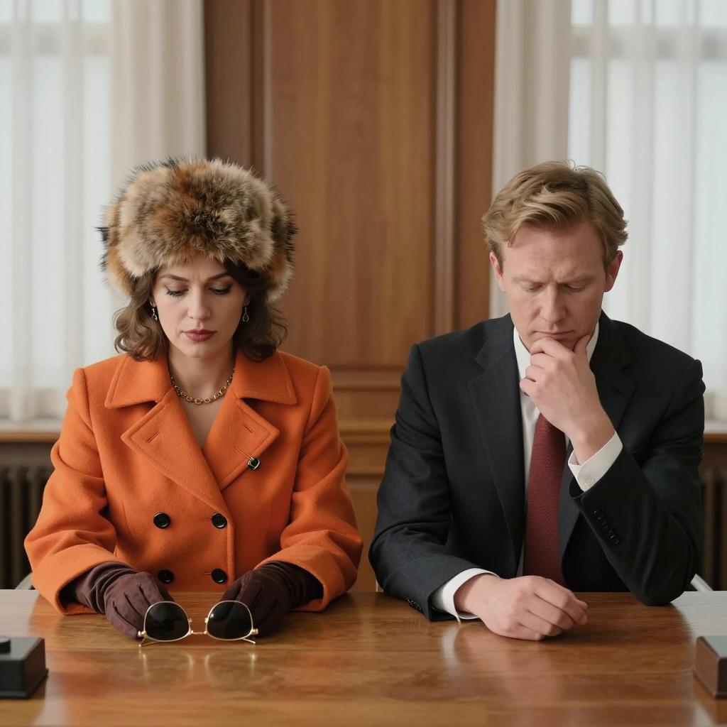 Office scene photograph. Woman with short brown hair, brown suit, white shirt, standing, hand on man's shoulder. Man with receding hairline, brown suit, red tie, talking on phone, looking angry. Green walls, blinds, trophy, lamp, papers on desk. Two people, man seated, woman standing. Natural light.