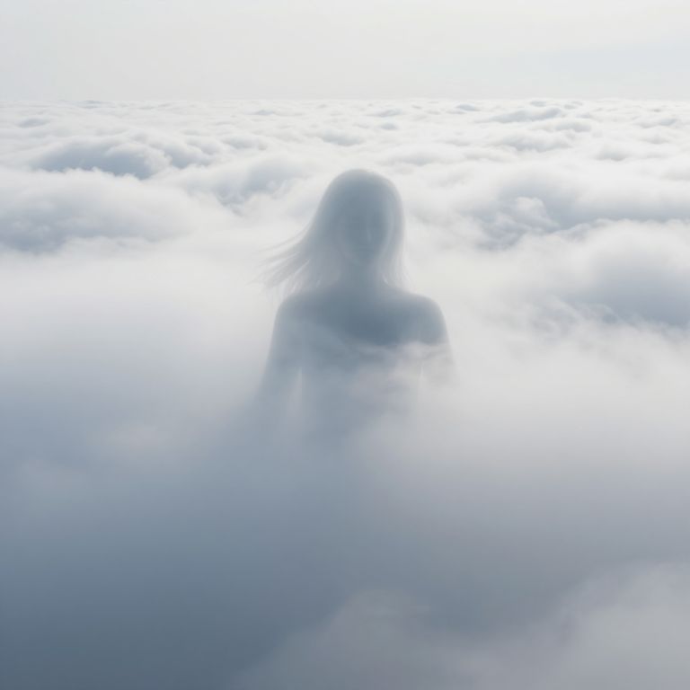 Faint silhouette of a person with long hair standing amidst a sea of white, fluffy clouds, creating a dreamy, ethereal atmosphere.
