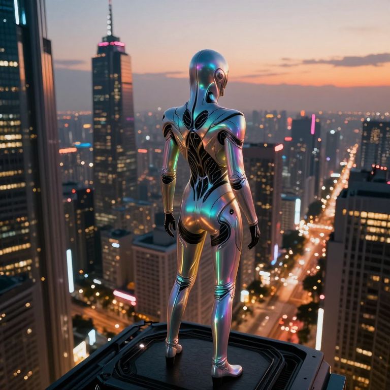 A digital CGI image depicts a futuristic, humanoid robot with a shiny, metallic silver body standing on a rooftop at sunset. The robot's design features intricate black circuit-like patterns across its chest, arms, and legs. Its head is bald and featureless, and it stands with arms slightly bent at the elbows. The background showcases a bustling cityscape with towering skyscrapers, illuminated windows, and a vibrant, colorful sunset sky. The city's streetlights create a glowing, neon-like effect along the streets below. The robot is centered, with the cityscape extending outwards in all directions.